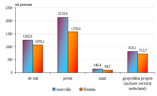 De asemenea, trebuie remarcat faptul cǎ in perioada 1990 - 2002, sectorul privat a inregistrat un progres semnificativ, contribuind, in anul 2001 cu 67,1% la crearea PIB, iar in 2002 cu 69%, comparativ cu numai 16,4% in anul 1990, ceea ce a determinat si schimbǎri semnificative ale ocupǎrii fortei de muncǎ de ambele sexe in sectorul de stat, asa cum reiese din graficul de mai jos: