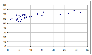 Figura 5.1. Corelatia dintre rata de participare la invatarea continua (pe orizontala) si rata de ocupare (pe verticala) in UE27, dupa Eurostat