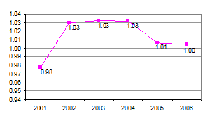 Figura 5.2. Rata de dependenta intre pensionarii de stat si persoanele angajate din Romania (dupa INS, 2007)