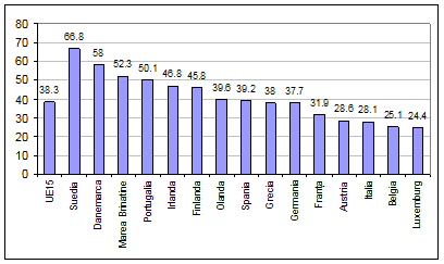 Figura 5.3. Ratele de ocupare ale muncitorilor in varsta in U15 in anul 2001, dupa Comisa Europeana (2003, 42)