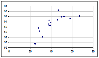 Figura 5.4. Corelatia dintre rata de ocupare in randul persoanelor in varsta (pe orizontala) si varsta medie reala de pensionare (pe verticala) pentru anul 2001, in UE15, dupa Eurostat si Comisa Europeana (2003, 42)