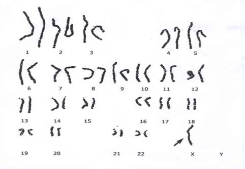 - REZULTATE : S-au efectuat culturi de limfocite din sange periferic, sacrificate la 72 ore. Preparatele cromozomiale obtinute au fost colorate prin metoda de bandare G cu tripsin. In urma analizarii a 50 de metafaze se constata ca pacienta prezinta un cariotop 45,X0, caracteristic Sindromului Turner.