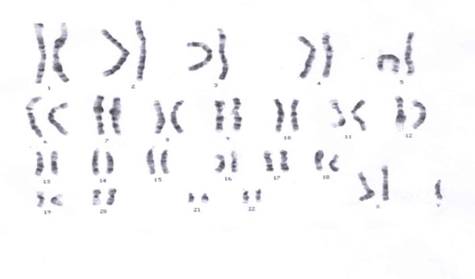 REZULTAT : S-au efectuat culturi de limfocite din sange periferic, sacrificate la 72 ore. Pe preparatele cromozomiale obtinute s-a plicat metoda de bandare G cu tripsina. In urma examinarii a 50 de metafaze se constata ca pacientul prezinta cariotip 47,XXY, caracteristic Sindromului Klinefelter