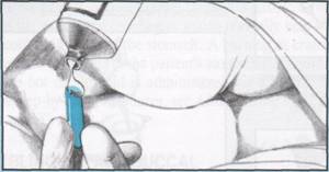 La introducere pozitia bolnavului este in decubit lateral cu membrele inferioare flectate. Se foloseste manusa de cauciuc, se departeaza fesele, se vizualizeaza orificiul anal iar cu cealalta mana se introduce supozitorul (ca mai sus).