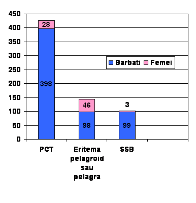 1. Pe un lot de etilici cronici format din 670 de bolnavi cu una sau mai multe din urmatoarele boli dermatologice: porfirie cutanata tardiva, pelagra sau SBB, am studiat impactul cresterii alcoolismului cronic ca fenomen general in Romania asupra internarilor in serviciul de dermatologie. Tabloul alcoolismului cronic in acest serviciu s-a dovedit a fi o reflectare destul de fidela a tabloului national si international. Astfel, distributia bolnavilor din lot pe ani arata o curba ascendenta ince-pind din 1999 pana in 2003, corespunzatoare cu cresterea generala a alcoolismului cronic in tara noastra si pe plan mondial. Raportul pe sexe al pacientilor din lot a fost 9:1 (barbati:femei), reflectand ponderea tot mai mare a consumuiui mare de etanol in randul populatiei feminine. Grupa de varsta cea mai afectata in grupul pacientilor cu PCT si al celor cu SBB este de 50-59 de ani, iar in grupul cu pelagra (orice forma clinica) este cea de 40-49 de ani. In ansamblu, numarul maxim de internari al etilicilor cronici in serviciul de dermatologie se inregistreaza la grupele de varsta intre 40 si 59 de ani, adica la o populate activa profesional. In afara cheltuielilor pentru spitalizare si tratament, societatea suporta deci costurile unor zile de munca neefectuate.