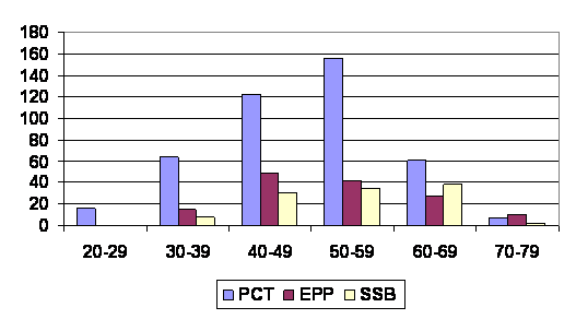 2. Pe un lot de 426 bolnavi etilici cronici cu PCT (90,61% din totalul de orice PCT de orice etiologie - proportia medie pe 5 ani, cu variatii nesemnificative de-a lungul anilor), am gasit ca proportia femeilor este relativ mica (6,57% din bolnavii lotului) si ca ponderea femeilor nu a inregistrat modificari semnificative in timpul celor 5 ani studiati.
