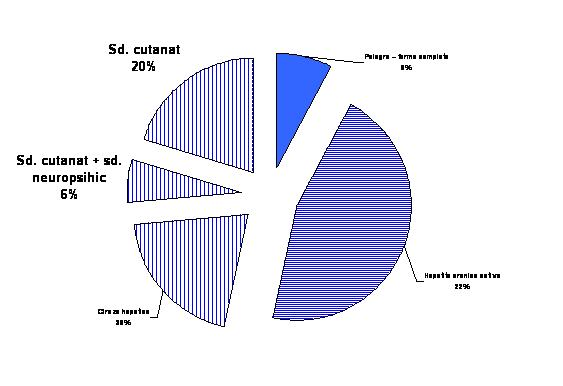3. Pe un lot format din 142 pacienti cu pelagra internati in 1999-2003, studiul a confirmat datele din literatura in ceea ce priveste raportul pe sexe (32,39% bolnavi de sex feminin si 67,61% de sex masculin) si ponderea etiologiei alcoolice in aparitia bolii (90,14%), ceea ce arata ca bolnavii cu pelagra se recruteaza in zilele de astazi aproape exclusiv din categoria alcoolicilor cronici.
