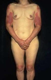 Foto 1. Eritem pelagroid, pacienta in virsta de 45 de ani, alcoolica de aproximativ 7 ani. |