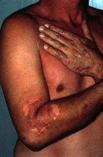 Foto 5: Etilism cronic, PCT: imagine de aproape a leziunii (bule, cicatrici, eritem) |