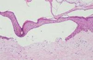 Foto 6 : PCT: Bula subepidermica, membrana bazala festonata, hialinizarea vaselor de sange, elastoza solara, corpusculi intracelulari "in senila". |
