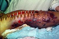 Foto 7: Fasciita necrotizanta la un bolnav alcoolic care a fost gasit in stare ebrietate. Aspect postoperator. |