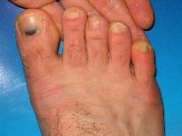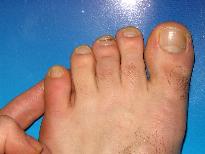 Foto 10. Pacient 25 de ani, internat pt etilism acut. La examenul fizic se evidentiaza onocomicoza incipenta dg. V ambe picioara si marci traumatice (hematoame subunghiale) la halucele drept si dg. III picior sting. Anamneza amanuntita si aplicarea chestionarelor incadreaza pacientul in clasa dependentilor cronici de alcool. |