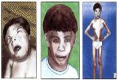 Atrofie si hipotonie a muschilor gambieri bilateral. Bolnav subponderal, dentitie cu lipsuri mari.