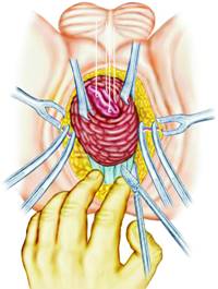 Se practica o incizie mediana suprapubiana prelungita putin supraombilical. Dupa protejarea peretelui prin campuri se monteaza un departator autostatic.