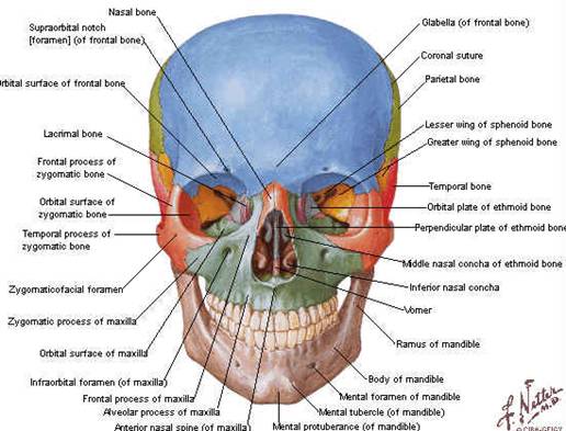 viscerocraniul, formand oasele fetei (maxilarul, mandibula, osul nazal, osul