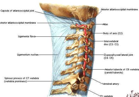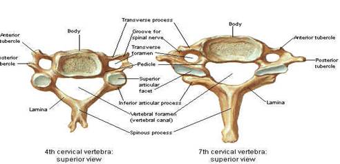 coloana vertebrala, alcatuita din 34 de vertebre, impartite dupa regiunile carora le apartin: 7 cervicale, 12 toracale, 5 lombare, 5 sacrale si 5 coccigiene. Fiecare vertebra este formata dintr-un corp vertebral in partea anterioara si un arc vertebral in partea posterioara. Gaura vertebrala este cuprinsa intre arc si corp. Arcul vertebral poseda cate trei prelungiri - apofize: una posterioara - apofiza spinoasa, doua laterale - apofize transversale.