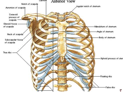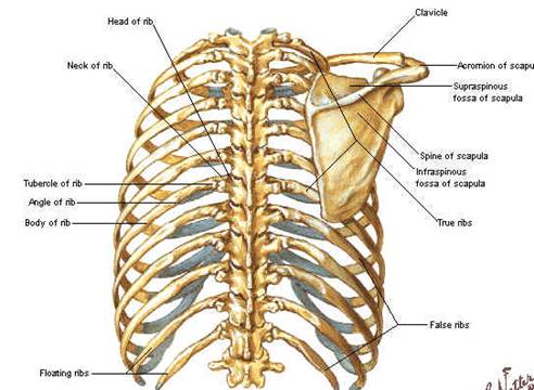 coaste, in numar de 12 perechi, din care primele 10 perechi se unesc cu sternul, ultimele doua perechi sunt "coaste flotante".