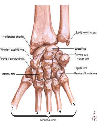 o mana, alcatuita din oasele carpiene (8), metacarpiene (5), falange (14)