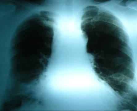 Figura 1. Radiografie cord-pulmon incidenta postero-anterioara: opacitati pulmonare bazal bilateral, arc aortic dilatat.
