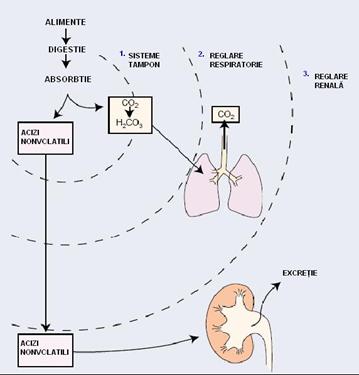 Reactiile enzimatice si implicit procesele biologice depind in mare masura de concentratia ionilor de hidrogen din mediu. Limitele fiziologice acceptate de laboratoarele clinice pentru pH-ul plasmatic sunt 7,35 - 7,45, dar in vivo ele sunt mai restranse. Mentinerea intre aceste limite necesita mecanisme homeostatice eficiente, care mentin echilibrul intre procesele fiziologice care genereaza H+ si cele care reduc concentratia de H+.