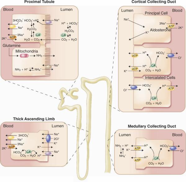 In rinichi, la nivelul glomerulilor se vor filtra nu numai diferitii acizi nevolatili (de regula sub forma de saruri de sodiu), dar si toti electrolitii, inclusiv sistemele tampon micromoleculare. Tubii renali sunt insa dotati cu mecanisme prin care cationii de Na+ si anionii bicarbonat sunt reabsorbiti din ultrafiltrat, fiind schimbati cu H+, care se secreta in lumenul tubilor uriniferi.