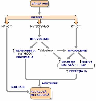 Pierdere excesiva de H+ (varsaturi excesive, hiperadrenocorticism)
