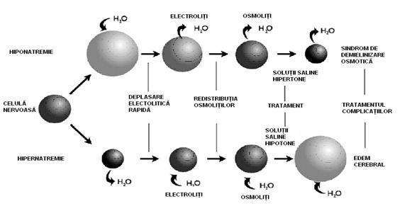Manifestarile clinice sunt determinate in special (ca si in cazul deficitului de sodiu) de o hiperhidratare celulara la nivelul sistemului nervos central.