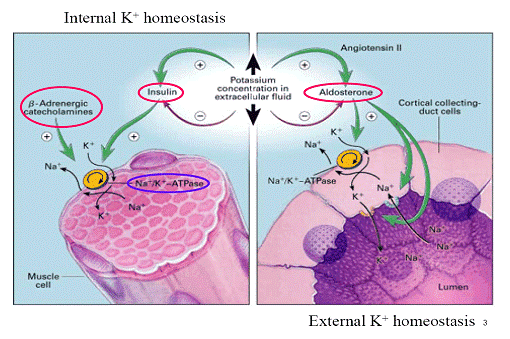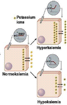 In conditii normale concentratia potasiului plasmatic este mentinuta intre limite destul de stanse (3,5 - 5,5 mEq/l). Potasiul este localizat cu predominanta intracelular, iar variatiile concentratiilor sale in plasma dau doar indicatii aproximative asupra continutului in potasiu al organismului.