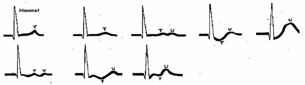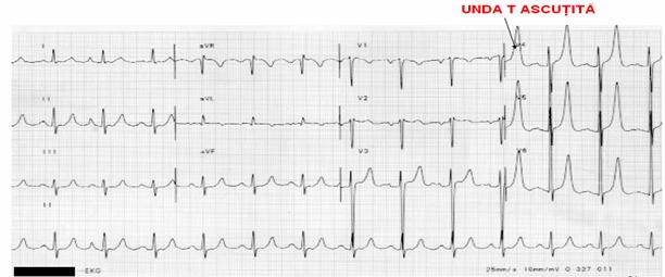 o La nivelul cordului se produc modificari progresive ale ECG, incepand cu aspecte de unda T ascutita la cresteri mici ale K+ si culminand in excese severe cu largirea QRS, fibrilatie ventriculara sau asistolie.