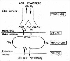 Figura 2 indica schimburile de gaze intre organism si mediu, la care concura sistemul respirator si sistemul de transport al gazelor in corp. Respiratia, proces metabolic continuu, consta din respiratia externa (pulmonara), prin care se asigura afluxul de O2 si eliminarea CO2 si din respiratia interna (tisulara), realizata la nivelul celulei. Oxigenul este absorbit de plaman prin ventilatie pulmonara si este transportat de sangele arterial la tesuturi, unde se produc arderile intracelulare, rezultand CO2. Acesta din urma revine pe calea venoasa spre plamani si este eliminat prin aerul expirat.