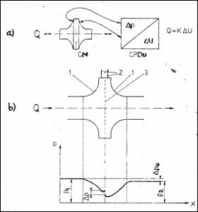 Diferenta de presiune este detectata cu un convertor presiune diferentiala-tensiune (CPDu). Domeniul tensiunii de la iesirea convertorului este de exemplu 500 mV, pentru un debit de 600 l/min. In Figura 4(b) este redata variatia presiunii in traductor; elementele 1 sunt flanse, 2 - prizele de masurare a presiunii diferentiale iar 3 - sita metalica.
