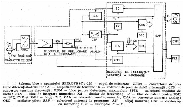 in care V este volumul de aer, D(t ) - variatia debitului inspirat (expirat) iar t1 si t2 sunt momentele de timp ce marcheaza inspiratia / expiratia. Aparatul SPIROTEST ( Gli88 ) masoara 14 parametrii fiziologici prin programe implementate hardware. In regim de lucru, blocul SPIR selecteaza parametrul ce va fi calculat, iar etajul SAP alege programul de investigatie. Semnalul de la traductorul de debit este amplificat in amplificatorul A si redresat in blocul R. Tensiunea rezultata este convertita in semnal numeric de catre CTF si aplicata integratorului BIN. Daca se masoara un volum, la SAP se aplica doar semnalele generate de BIN si SPIR. Daca se determina debitul de varf, la blocul SAP se aplica si semnalul de la BDM si valoarea maxima a debitului convertita numeric de catre CAN. Blocul de calcul, BC, este necesar pentru determinarea debitului inspirat / expirat la 50% din capacitatea vitala fortata. CAN este util cand aparatul se cupleaza cu un osciloscop cu memorie (DSP) sau cu un inscriptor grafic X-Y (PLT). Afisarea rezultatelor este realizata cu afisajul numeric (AN).
