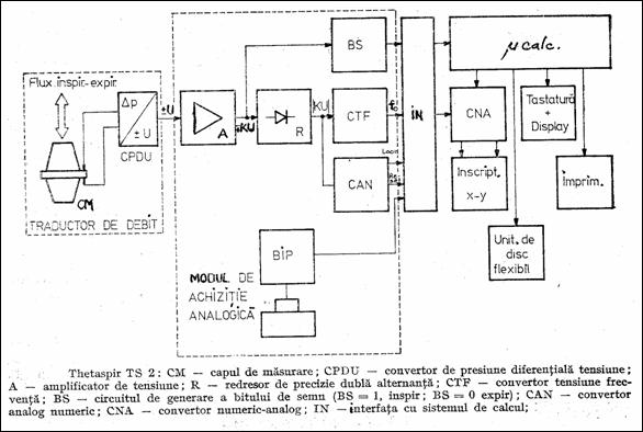 O varianta perfectionata a spirometrului descris anterior este aparatul pentru masurarea si controlul respiratiei, THETASPIR (Figura 7, Gli88 ). Traductorul si modulul de achizitie sunt comune cu cele ale aparatului SPIROTEST. Interfata numerica (IN) permite cuplarea cu un microsistem de calcul, care permite reducerea duratei investigatiei si cresterea numarului de parametri analizati (toti cei 62 specifici sistemului respirator). Sunt posibile reprezentari grafice ale debitului si volumelor, spirograme, calculul valorilor teoretice (prescrise), corectii, memorarea si arhivarea datelor, calcule statistice etc. Achizitia se face in timp real iar spirograma este afisata pe ecranul microcalculatorului. Programul general de calcul are trei niveluri: 1 - protocolul de achizitie a datelor; 2 - calibrarea aparatului si masurarea celor 62 de parametri; 3 - dialogul cu perifericele.