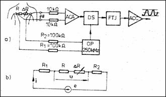 in care R este rezistenta pacientului intre electrozi cand nu exista respiratie iar DR este variatia de rezistenta in prezenta respiratiei. Curentul i este foarte mic (mA). Semnalul amplificat este aplicat unui detector sincron (DS); la iesirea acestuia, filtrul trece-jos (FTJ) separa si retine semnalul purtator, care variaza in ritmul respiratiei. Amplificatorul de curent continuu (ACC) amplifica semnalul util pentru afisare sau pentru a fi preluat de un pneumotahometru.