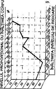corpului sau (125 ). Fixand si apoi unind cele doua puncte (125 cm pe coloana din dreapta cu 70% pe coloana din stanga) vom intersecta curba graficului intr-un anumit punct, din care, coborand o verticala gasim greutatea posibila de ridicat (circa 23 kg). Deci, executantul respectiv nu poate manipula greutati de 50 kg la inaltimea de 125 cm, ca sarcina permanenta de lucru.