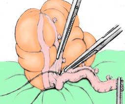 Fig. 12 - Apendicectomia retrograda. Stanga: identificarea bazei apendicelui;