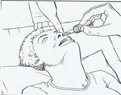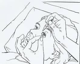 se trage in jos si in afara pleoapele inferioare cu policele mainii stangi folosind un tampon
