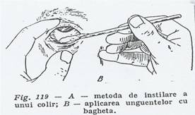 2) Unguentele oculare: se aplica pe fundul de sac conjunctival sau pe marginea pleoapelor, din tub sau din cutie, cu ajutorul unei baghete de sticla rotunjita fin si latita la o extremitate.