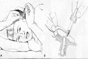 bolnavul se aseaza in decubit dorsal sau pe scaun cu capul aplecat pe spate si sprijinit
