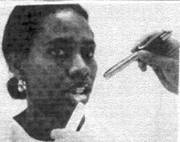 se ridica usor varful nasului cu policele mainii stangi pentru a evidential mai bine narina (sau orificiul extern al fosei nazale