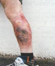 2. Escara electrica - Leziunii termice pure, determinata de efectul Joule, proportional cu rezistenta fiecarui tesut, i se adauga si efectele speciale ale electricitatii asupra tesuturilor vii. Daca organismul nu a sucombat prin electrocutie, arsurii i se adauga efectul cuagulant intravascular instantaneu, cu precipitarea intensa a proteinei contractile musculare, si cu miozita necrozanta, cu evolutie gangrenoasa, de obicei gazoasa extensibila.