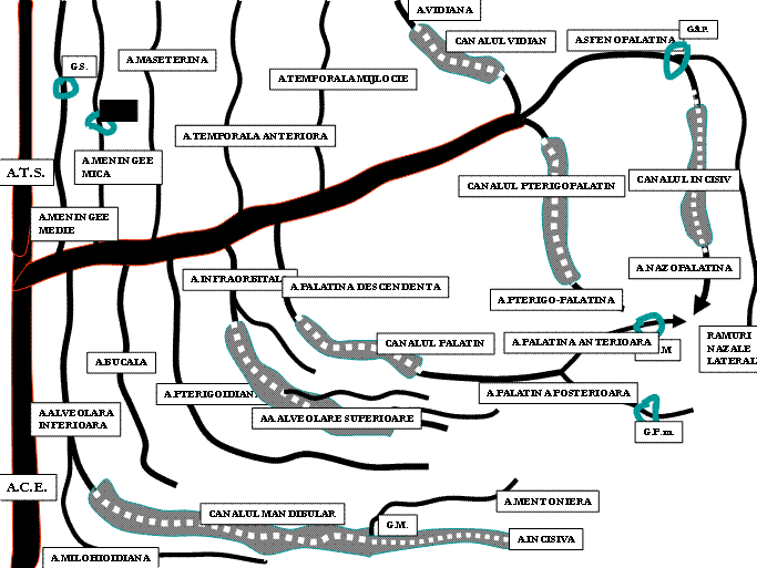 L. Artera paltina descendenta. Din fosa pterigopalatina are un traiect descendent strabatand canalul pterigopalatin, unde se imparte in: