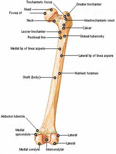 Femurul: format din epifiza proximala, ce reprezinta capul femurului, colul si doua tuberozitati (marele si micul trohanter). Capul are forma a 2/3 de sfera si se articuleaza cu cavitatea acetabulara a coxalului mare si micul trohanter, sunt uniti anterior prin linia intertrohanterica iar posterior prin creasta intertrohanterica.
