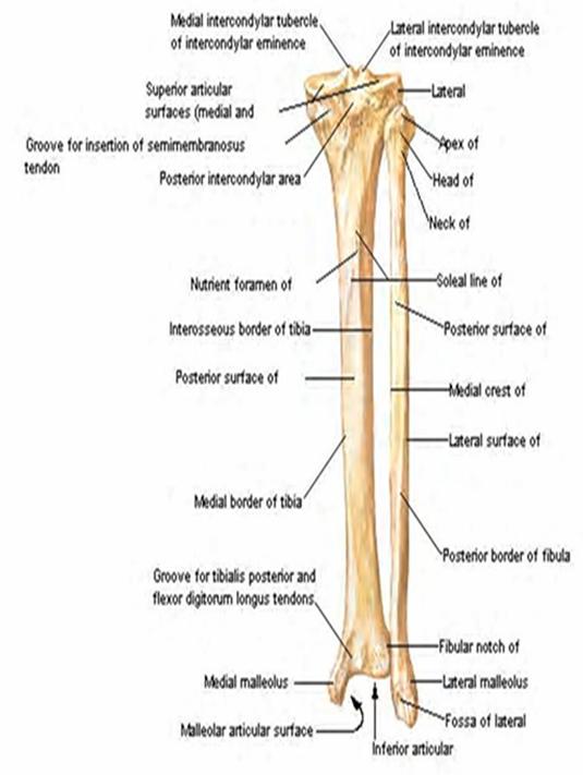 - marginea laterala (margo interosseus) priveste spre fibula si serveste pentru insertia membranei interosoase, care leaga tibia de fibula;
