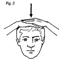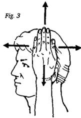 Cand durerea s-a mai atenuat, exercitati presiunea, simultan, cu palmele asupra regiunilor temporale stanga si dreapta (fig. 1). Fiecare apasare va dura zece secunde. Repetati de trei ori. Apoi, cu ambele maini, una deasupra celeilalte, apasati timp de zece secunde regiunea parietala (fig. 2). Repetati de trei ori.