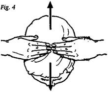 In cele din urma, tratati regiunea parietala. Plasati ambele maini pe partea usor anterioara a regiunii parietale, varfurile degetelor atingandu-se. Miscati mainile inainte timp de cinci secunde (fig. 4). Apoi, mentinandu-le in aceeasi pozitie relativa, miscati-le spre zona occipitala.