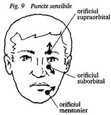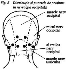 occipital si marele nerv auricular (fig. 5). Pe acesti nervi, exista puncte dureroase la presiune. Durerea care se manifesta intr-o singura parte sau de ambele parti ale regiunii occipitale caracterizeaza nevralgia occipitala, care poate fi provocata de tensiunea din muschii sau din ligamentele regiunii occipitale, de arterioscleroza, de depunerile de strat adipos, de sindromul "loviturii de bici' etc.