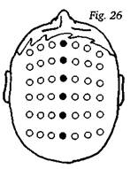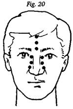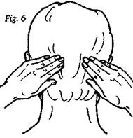Incepand cu sirul din mijloc ce porneste de la linia de implantare a parului, apasati cu indexul, degetul mijlociu si inelarul ambelor maini suprapuse fiecare din cele sase puncte ce il alcatuiesc (fig. 26). Fiecare presiune trebuie sa dureze trei secunde. Repetati de trei ori.