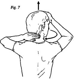 Stretching. Atunci cand durerea este pe partea stanga, intoarceti usor fata spre dreapta. Puneti palma stanga pe ceafa, usor spre stanga, iar palma dreapta pe partea dreapta a fruntii (fig. 7). (Pentru durerea din partea dreapta, mainile se pun invers.) Trageti in sus mainile si mentineti pozitia timp de zece secunde. Repetati cat de des este necesar, pentru a ameliora simptomele. Important este ca nu deplasarea mainilor in sus, ci pozitia de stretching, cu apasarea corespunzatoare, sa dureze zece secunde.