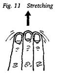 Stretching. Cu indexul, degetul mijlociu si inelarul, executati stretching asupra fiecarui punct dureros, in directia aratata in fig. 9. Fiecare intindere trebuie sa dureze cinci sau sase secunde (fig. 11). Repetati cat de des este necesar.